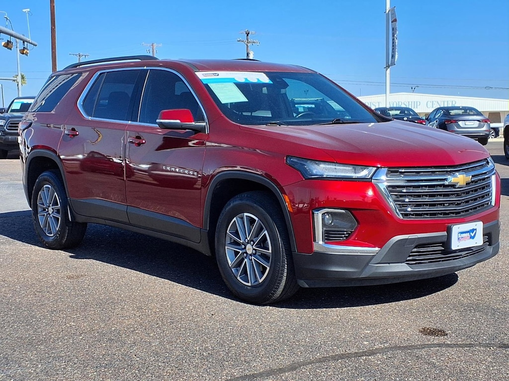 This 2023 Chevrolet Traverse LT 1LT in Radiant Red Tintcoat comes with the following features: 3.6L V6 SIDI VVT 9-Speed Automatic FWD Convenience & Driver Confidence Package (4.2" Multi-Color Enhanced Driver Instrument Display, Heated Driver & Front Passenger Seats, Radio: Chevrolet Infotainment 3 Plus System, Rear Power Liftgate, Remote Start, SiriusXM w/360L, and Universal Home Remote), Front License Plate Bracket Mounting Package, Interior Protection Package (LPO) (1st & 2nd Row All-Weather Floor Mats, 3rd Row All-Weather Floor Mats, and All-Weather Cargo Mat (LPO)), Preferred Equipment Group 1LT, Sames Certified Certified, 2-Way Manual Front Passenger Seat Adjuster, 3.49 Axle Ratio, 3rd row seats: split-bench, 4-Wheel Disc Brakes, 6 Speakers, 6-Speaker Audio System Feature, 8-Way Power Driver Seat Adjuster, ABS brakes, Air Conditioning, Alloy wheels, AM/FM radio: SiriusXM, Apple CarPlay/Android Auto, Auto High-beam Headlights, Automatic temperature control, Black Roof Rails, Brake assist, Bumpers: body-color, Compass, Delay-off headlights, Driver door bin, Driver vanity mirror, Dual front impact airbags, Dual front side impact airbags, Electronic Stability Control, Emergency communication system, Exterior Parking Camera Rear, Four wheel independent suspension, Front anti-roll bar, Front Bucket Seats, Front Center Armrest, Front dual zone A/C, Front reading lights, Fully automatic headlights, Heated door mirrors, Illuminated entry, Leather steering wheel, Low tire pressure warning, Not Equipped w/Rear Park Assist (060), Occupant sensing airbag, Outside temperature display, Overhead airbag, Overhead console, Panic alarm, Passenger door bin, Passenger vanity mirror, Power door mirrors, Power Driver Lumbar Control, Power driver seat, Power steering, Power windows, Premium Cloth Seat Trim, Radio data system, Radio: Chevrolet Infotainment System AM/FM Stereo, Rear air conditioning, Rear anti-roll bar, Rear reading lights, Rear window defroster, Rear window wiper, Remote keyless entry, Security system, SiriusXM Radio, Speed control, Speed-sensing steering, Spoiler, Steering wheel mounted audio controls, Tachometer, Telescoping steering wheel, Tilt steering wheel, Traction control, Trip computer, Turn signal indicator mirrors, Variably intermittent wipers, Voltmeter, and Wheels: 18" Bright Silver-Painted Aluminum.