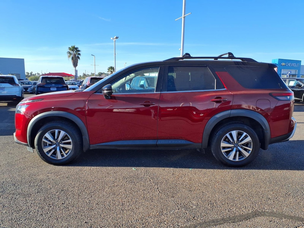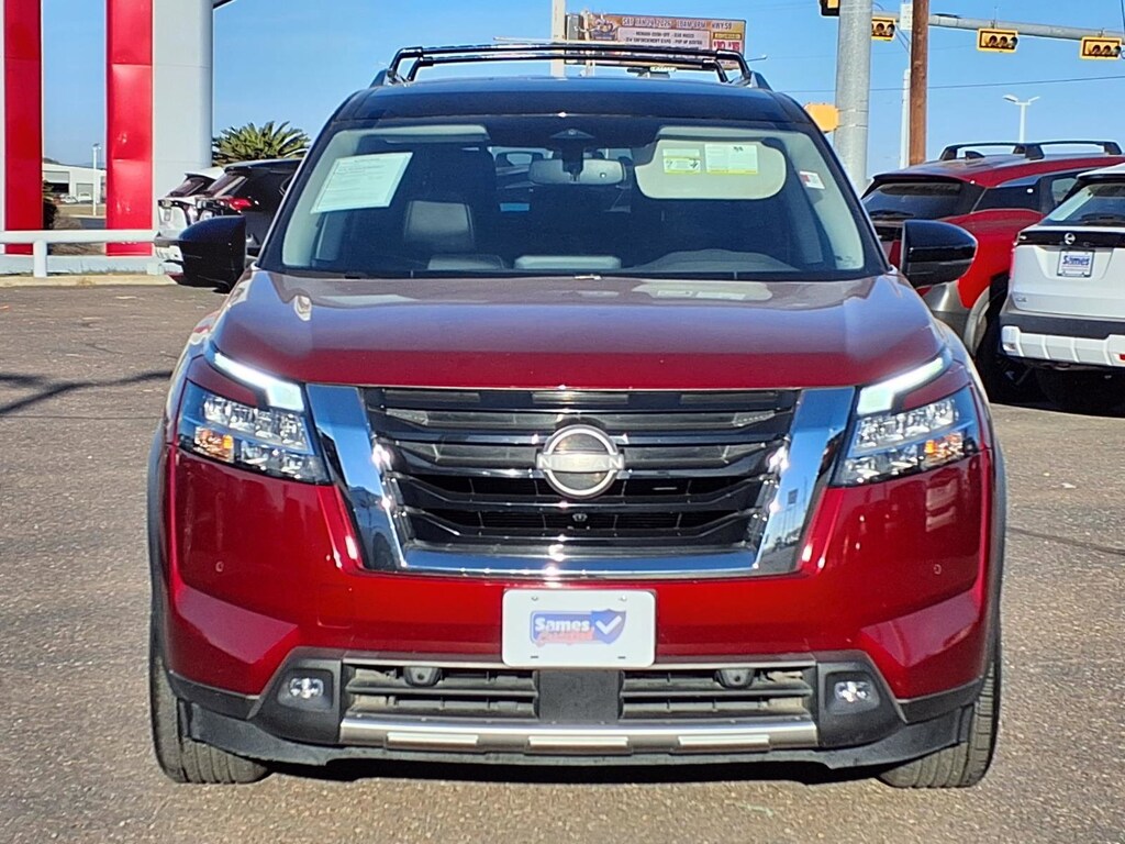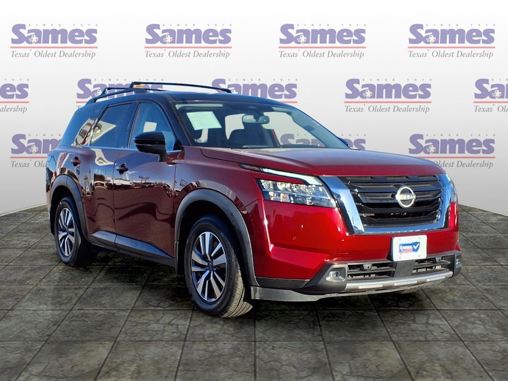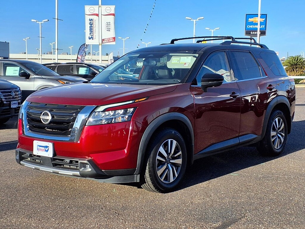 This 2022 Nissan Pathfinder SL in Scarlet Ember Tintcoat/Super Black comes with the following features: V6 9-Speed Automatic FWD Sames Certified Certified, 18" Machined Alloy Wheels, 3rd row seats: bench, 4-Wheel Disc Brakes, 6 Speakers, ABS brakes, Air Conditioning, Alloy wheels, AM/FM radio: SiriusXM, Auto High-beam Headlights, Auto-dimming Rear-View mirror, Automatic temperature control, Axle Ratio: TBD, Bench Seat Carpeted Floor Mats (Set of 4), Black Splash Guards (Set of 4), Brake assist, Bumpers: body-color, Cross Bars, Delay-off headlights, Driver door bin, Driver vanity mirror, Dual front impact airbags, Dual front side impact airbags, Electronic Stability Control, Emergency communication system: NissanConnect Services, Exterior Parking Camera Rear, Four wheel independent suspension, Front anti-roll bar, Front Bucket Seats, Front Center Armrest, Front dual zone A/C, Front fog lights, Front reading lights, Fully automatic headlights, Garage door transmitter: HomeLink, Heated door mirrors, Heated Front Bucket Seats, Heated front seats, Heated steering wheel, Illuminated entry, Knee airbag, Leather Seating Surfaces, Leather steering wheel, Low tire pressure warning, Navigation system: NissanConnect Navigation, NissanConnect w/Navigation & Services, Occupant sensing airbag, Outside temperature display, Overhead airbag, Overhead console, Panic alarm, Passenger door bin, Passenger vanity mirror, Power door mirrors, Power driver seat, Power Liftgate, Power passenger seat, Power steering, Power windows, Radio data system, Radio: AM/FM Audio System, Rear air conditioning, Rear anti-roll bar, Rear reading lights, Rear seat center armrest, Rear side impact airbag, Rear window defroster, Rear window wiper, Reclining 3rd row seat, Remote keyless entry, Security system, Speed control, Speed-sensing steering, Split folding rear seat, Spoiler, Steering wheel mounted audio controls, Tachometer, Telescoping steering wheel, Tilt steering wheel, Traction control, Trip computer, Turn signal indicator mirrors, and Variably intermittent wipers.