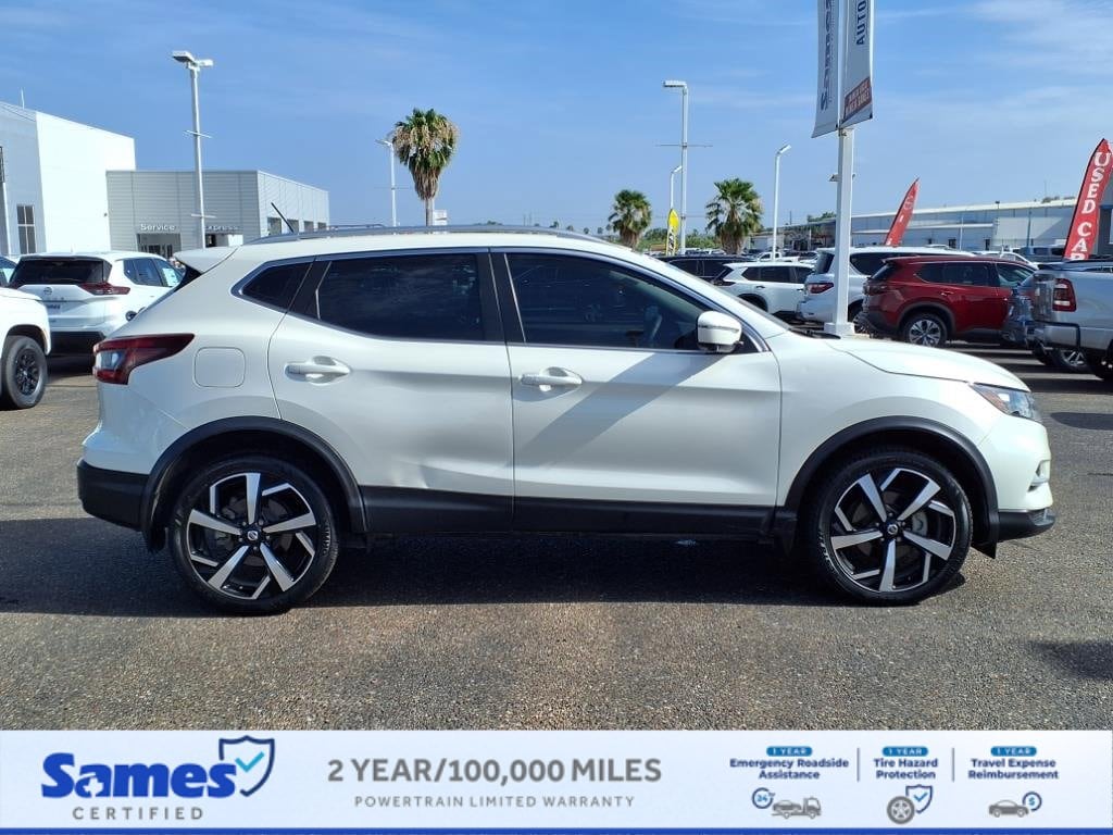 This 2022 Nissan Rogue Sport SL in Pearl White Tricoat comes with the following features: 2.0L DOHC CVT with Xtronic AWD Sames Certified Certified, 2-Piece Carpeted Cargo Area Protector & Floor Mats, 4-Wheel Disc Brakes, 6 Speakers, 6.39 Axle Ratio, ABS brakes, Air Conditioning, Alloy wheels, AM/FM radio: SiriusXM, Auto High-beam Headlights, Automatic temperature control, Blind Spot Warning, Brake assist, Bumpers: body-color, CD player, Chrome Rear Bumper Protector, Delay-off headlights, Driver door bin, Driver vanity mirror, Dual front impact airbags, Dual front side impact airbags, Electronic Stability Control, Emergency communication system: NissanConnect Services, Exterior Parking Camera Rear, First Aid Kit, Four wheel independent suspension, Front anti-roll bar, Front Bucket Seats, Front Center Armrest, Front dual zone A/C, Front reading lights, Fully automatic headlights, Heated door mirrors, Heated front seats, Heated steering wheel, Illuminated entry, Knee airbag, Leather-Appointed Seat Trim, Low tire pressure warning, Navigation system: NissanConnect Navigation, NissanConnect featuring Apple CarPlay and Android Auto, NissanConnect Services Powered By SiriusXM, Occupant sensing airbag, Outside temperature display, Overhead airbag, Overhead console, Panic alarm, Passenger door bin, Passenger vanity mirror, Power door mirrors, Power driver seat, Power passenger seat, Power steering, Power windows, Quick Comfort Heated Front Bucket Seats, Radio data system, Radio: AM/FM NissanConnect w/Navigation, Rear anti-roll bar, Rear Parking Sensors, Rear seat center armrest, Rear side impact airbag, Rear window defroster, Rear window wiper, Remote keyless entry, Security system, Speed control, Speed-sensing steering, Speed-Sensitive Wipers, Splash Guards, Split folding rear seat, Spoiler, Steering wheel mounted audio controls, Tachometer, Telescoping steering wheel, Tilt steering wheel, Traction control, Trip computer, Turn signal indicator mirrors, Variably intermittent wipers, and Wheels: 19" x 7.0" Aluminum Alloy.