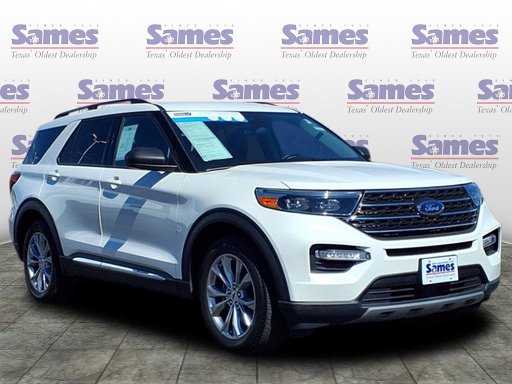 This 2023 Ford Explorer XLT in Star White Metallic Tri-Coat comes with the following features: 2.3L EcoBoost I-4 10-Speed Automatic RWD Equipment Group 202A (Heated ActiveX Captain's Chairs, Heated Steering Wheel, LED Fog Lamps, Remote Start System, and SecuriCode Keyless Entry Keypad), Ford Co-Pilot360 Assist+ (Evasive Steering Assist, Intelligent Adaptive Cruise Control, Speed Sign Recognition, and Voice-Activated Touchscreen Navigation System), Sames Certified Certified, 20" Premium Painted Aluminum Wheels, 3.58 Non-Limited-Slip Rear Axle Ratio, 3rd row seats: bench, 4-Wheel Disc Brakes, 4G LTE Wi-Fi Hotspot Credit, 6 Speakers, ABS brakes, Air Conditioning, Alloy wheels, AM/FM radio: SiriusXM, AM/FM Stereo, Auto High-beam Headlights, Automatic temperature control, Brake assist, Bumpers: body-color, Compass, Delay-off headlights, Driver door bin, Driver vanity mirror, Dual front impact airbags, Dual front side impact airbags, Electronic Stability Control, Emergency communication system: SYNC 3 911 Assist, Exterior Parking Camera Rear, FordPass Connect, Four wheel independent suspension, Front anti-roll bar, Front Bucket Seats, Front Center Armrest, Front dual zone A/C, Front reading lights, Fully automatic headlights, Heated door mirrors, Heated front seats, Heated Unique Cloth Captain's Chairs, Illuminated entry, Knee airbag, Leather steering wheel, Low tire pressure warning, Occupant sensing airbag, Outside temperature display, Overhead airbag, Overhead console, Panic alarm, Passenger door bin, Passenger vanity mirror, Power door mirrors, Power driver seat, Power Liftgate, Power passenger seat, Power steering, Power windows, Rear air conditioning, Rear anti-roll bar, Rear Auxiliary Controls Credit, Rear reading lights, Rear window defroster, Rear window wiper, Remote keyless entry, Roof rack: rails only, Security system, Speed control, Speed-sensing steering, Speed-Sensitive Wipers, Split folding rear seat, Spoiler, Steering wheel mounted audio controls, SYNC 3 Communications & Entertainment System, SYNC 3/Apple CarPlay/Android Auto, Tachometer, Telescoping steering wheel, Tilt steering wheel, Traction control, Trip computer, Variably intermittent wipers, and Wheels: 18" 5-Spoke Silver-Painted Aluminum.