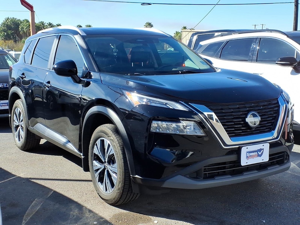 This 2023 Nissan Rogue SV in Super Black comes with the following features: 1.5L I3 Turbocharged DOHC 12V LEV3-ULEV50 201hp CVT with Xtronic FWD SV Premium B Package (Heated Driver & Front Passenger Seats, Heated Leather Wrapped Steering Wheel, Leatherette Door Trim Inserts w/Stitch, Panoramic Moonroof, Power Liftgate, PRIMATEX Leatherette Seat Trim, Rear Door Sunshades, Rear Personal Lights, Security Alarm, and Silver Painted Roof Rails), 18" Aluminum Alloy Wheels, 4-Wheel Disc Brakes, 5.604 Axle Ratio, 6 Speakers, ABS brakes, Air Conditioning, Alloy wheels, AM/FM Radio, AM/FM radio: SiriusXM, Auto High-beam Headlights, Automatic temperature control, Black Splash Guards (Set of 4), Brake assist, Bumpers: body-color, Chrome Rear Bumper Protector, Cloth Seat Trim, Delay-off headlights, Driver door bin, Driver vanity mirror, Dual front impact airbags, Dual front side impact airbags, Electronic Stability Control, Emergency communication system: NissanConnect Services, Floor Mats w/1-Piece Cargo Area Protector, Four wheel independent suspension, Front anti-roll bar, Front Bucket Seats, Front Center Armrest, Front dual zone A/C, Front reading lights, Fully automatic headlights, Heated door mirrors, Illuminated entry, Illuminated Kick Plates, Knee airbag, Low tire pressure warning, NissanConnect featuring Apple CarPlay and Android Auto, Occupant sensing airbag, Outside temperature display, Overhead airbag, Overhead console, Panic alarm, Passenger door bin, Passenger vanity mirror, Power door mirrors, Power driver seat, Power steering, Power windows, Radio data system, Rear anti-roll bar, Rear Parking Sensors, Rear seat center armrest, Rear side impact airbag, Rear window defroster, Rear window wiper, Remote keyless entry, Speed control, Speed-Sensitive Wipers, Split folding rear seat, Spoiler, Steering wheel mounted audio controls, Tachometer, Telescoping steering wheel, Tilt steering wheel, Traction control, Trip computer, and Variably intermittent wipers.